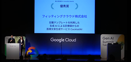 当社が提供する、生成AIを活用した医療文書向け文章生成ソリューション「CocktailAI」が、2024年10月24日に開催されたGoogle Cloud主催「Generative AI Summit Tokyo '24 Fall」のピッチコンテスト「第2回生成AI Innovation Awards」において、優秀賞を受賞しました。