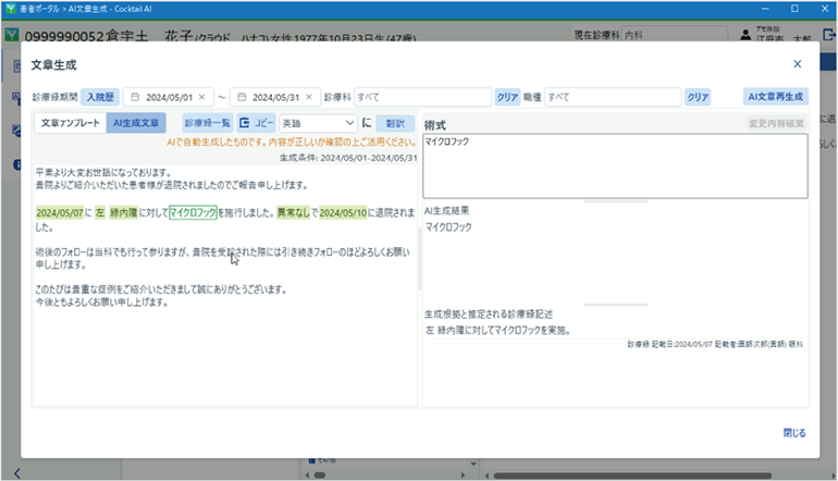 - 生成AIによるテンプレートを利用した診療録からの医療文章生成※